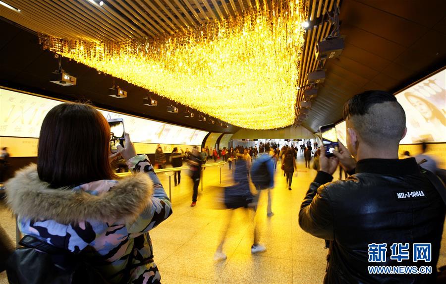 3月22日,市民在換乘通道用手機拍攝金色燈帶。近日,上海地鐵徐家匯站1號線、9號線和11號線的換乘通道內安裝了一條長約20米的金色燈帶,在換乘通道內營造出一種奇幻的光影效果,為趕路市民的旅途增添了一抹亮色。新華社記者方喆攝