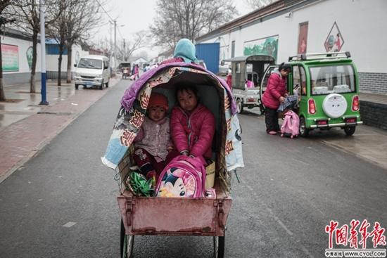 河北省香河縣王店子村二年級(jí)的王欣茹(右)和妹妹坐在奶奶的三輪車上放學(xué)回家。她們的父母都在香河縣城工作,平時(shí)由奶奶照看。