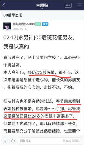 百度貼吧里的“00后早戀吧”里已經有了兩千多萬的帖子,去年還有一位00后曾貼出“征婚帖”: