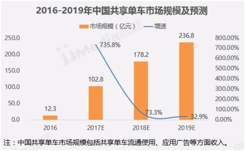 iiMedia Research(艾媒咨詢)數(shù)據(jù)顯示,2016年中國(guó)共享單車(chē)市場(chǎng)規(guī)模為12.3億元,預(yù)計(jì)在2017年將達(dá)到102.8億元,增長(zhǎng)率高達(dá)735.8%;而用戶規(guī)模為0.28億人,預(yù)計(jì)在2017年將達(dá)2.09億人,增長(zhǎng)率亦有646.4%,中國(guó)共享單車(chē)市場(chǎng)將繼續(xù)保持超高速增長(zhǎng)。