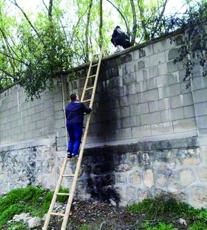 4月2日下午1時(shí)許,這位婦女打電話詢(xún)問(wèn)后稱(chēng),可以帶人過(guò)去,但需要交10元的車(chē)費(fèi)。記者同意后,這位婦女開(kāi)著摩的,將兩名記者拉到西安秦嶺野生動(dòng)物園旁的內(nèi)苑村村子里,在一個(gè)緊挨著圍墻的路邊,有三個(gè)年輕小伙子在墻邊架著4米多高的竹梯,三人陸續(xù)上墻頂后,將另外一個(gè)竹梯搭在另外一邊,其中一人坐在墻頂,另外兩人進(jìn)入園區(qū)內(nèi)看有無(wú)安保人員經(jīng)過(guò),確認(rèn)無(wú)誤后招呼記者上墻進(jìn)入園區(qū)(如圖)。