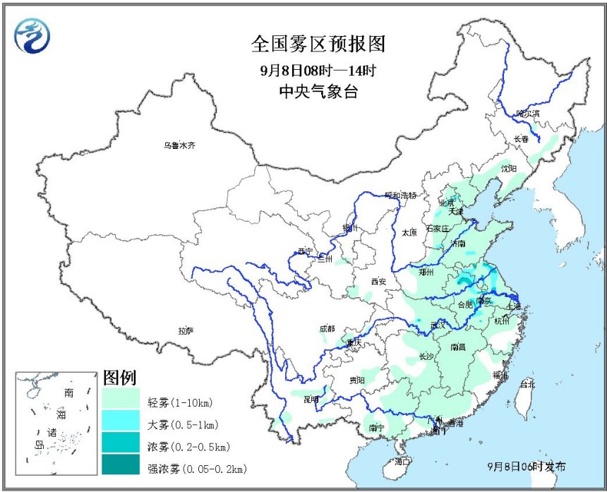 人民網北京9月8日電 據中央氣象臺網站消息,8日早晨至上午,安徽、江蘇中北部、山東南部、河北中部、北京東南部等地的部分地區有能見度不足1km的大霧,局地能見度將不足500米。