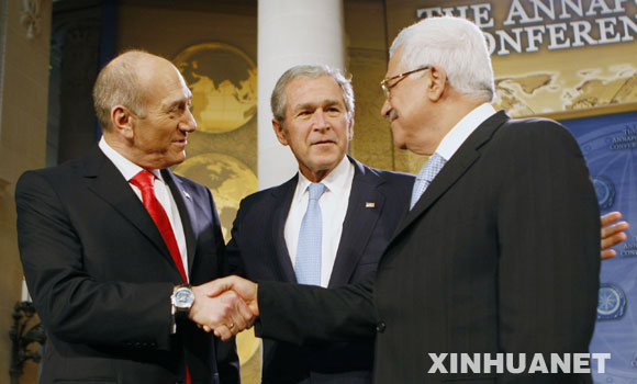 11月27日,在美國(guó)馬里蘭州安納波利斯,以色列總理奧爾默特(左)和巴勒斯坦民族權(quán)力機(jī)構(gòu)主席阿巴斯在美國(guó)總統(tǒng)布什(中)面前握手。當(dāng)日,由美國(guó)提議并主持召開的中東問(wèn)題安納波利斯會(huì)議在安納波利斯開幕。 新華社發(fā)