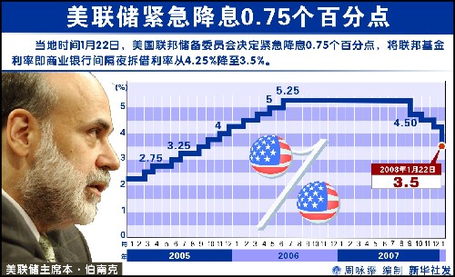 當天紐約股市開盤前,美聯儲宣布緊急降息0.75個百分點,將聯邦基金利率從4.25%降至3.50%。不過,由于全球股市大幅走低,而當天紐約股市休市,紐約股市22日開盤后呈現補跌行情,道瓊斯30種工業股票平均價格指數一度下跌近465點。此后,在美聯儲大幅降息的鼓舞下,市場逐漸回穩。