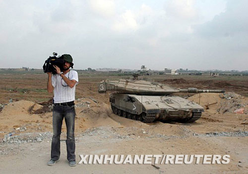 這張資料照片上顯示的是路透社攝像記者法德勒·沙納在加沙的一輛以色列坦克旁拍攝。 新華社/路透