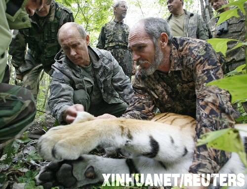 8月31日,在俄羅斯遠東地區,俄總理普京在科學家的幫助下為一只5歲的老虎戴上項圈。普京當日訪問西伯利亞虎保護區時,一只掉入陷阱的西伯利亞虎突然躥出,撲向附近的攝影師們,普京抓過一把用于麻醉的氣槍射擊,射中老虎肩胛處。虎中彈入睡后,普京親手為虎戴上裝備全球定位系統的項圈,以便科研人員監控它的動向和健康狀況。 新華社/路透