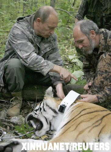 隨后,他在俄羅斯科學家維亞切斯拉夫·拉扎諾夫協助下,親手為虎戴上裝備全球定位系統的項圈,以便科研人員監控它的動向和健康狀況。
