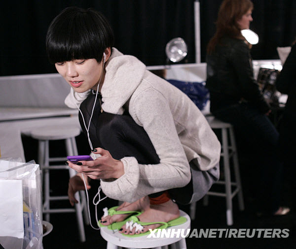 2月19日,在美國紐約時裝周的時裝表演之前,一位模特蹲在圓凳上等待化妝。新華社/路透