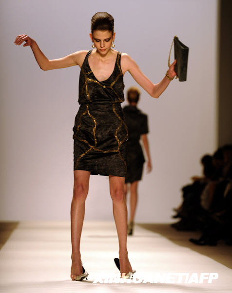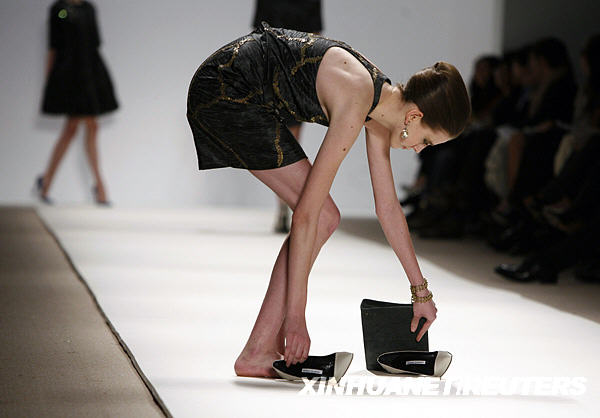 2月19日,在美國紐約時裝周的時裝表演期間,一位模特走脫了鞋。新華社/法新