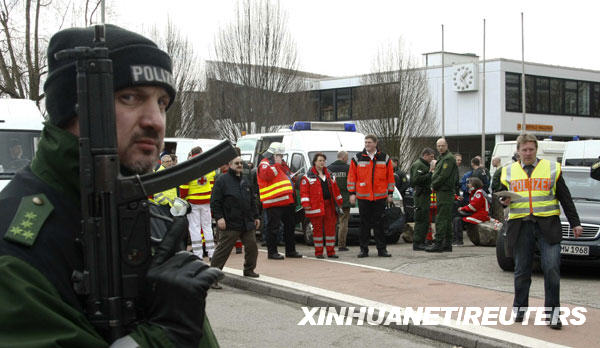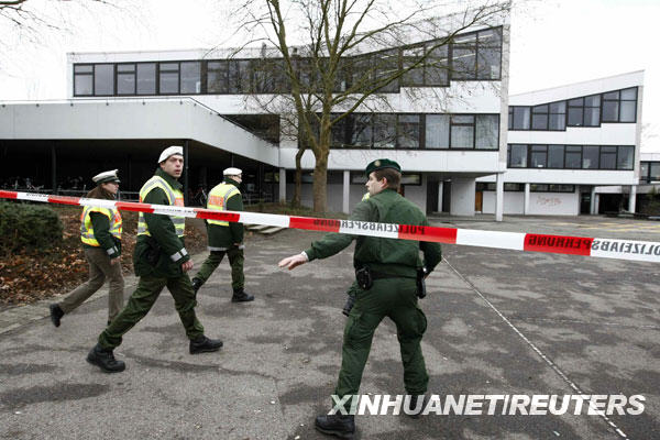 當(dāng)天早上,斯圖加特市附近小鎮(zhèn)溫嫩登一所名為艾伯特維爾的中學(xué)發(fā)生嚴(yán)重校園槍擊案。據(jù)德國(guó)警方公布的傷亡數(shù)字,槍擊案導(dǎo)致包括槍手在內(nèi)至少16人死亡。 新華社/路透