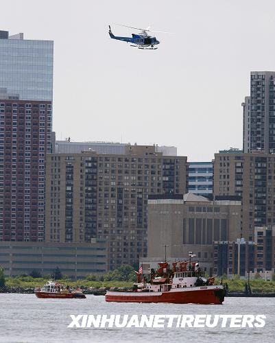 8月8日,在美國紐約曼哈頓島西側的哈德孫河上,一架警用直升機和救援船只在飛機墜毀地點開展救援。新華社/路透