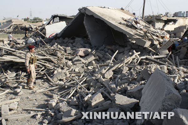 8月10日,在伊拉克北部城市摩蘇爾以東的卡茲那村,一名伊拉克警察在爆炸現場警戒。