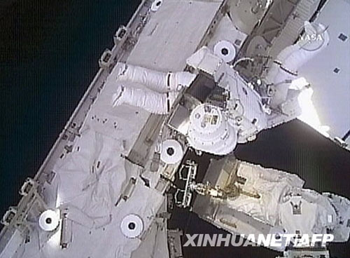 美國(guó)國(guó)家航空航天局9月1日發(fā)布的電視照片顯示,已與國(guó)際空間站成功對(duì)接的“發(fā)現(xiàn)”號(hào)航天飛機(jī)上的宇航員尼克爾·斯托特(右)和丹尼·奧利瓦斯進(jìn)行第一次太空行走。他們將換下一個(gè)如小汽車般大小的氨冷卻水箱并完成一些零件升級(jí)與維護(hù)。新華社/法新