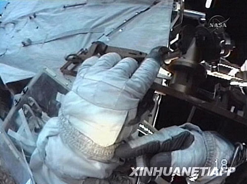 美國(guó)國(guó)家航空航天局9月1日發(fā)布的電視照片顯示,已與國(guó)際空間站成功對(duì)接的“發(fā)現(xiàn)”號(hào)航天飛機(jī)上的宇航員丹尼·奧利瓦斯進(jìn)行第一次太空行走時(shí)向人們展示他右手手套的輕微磨損。由宇航員尼克爾·斯托特和丹尼·奧利瓦斯執(zhí)行的第一次太空行走將換下一個(gè)如小汽車般大小的氨冷卻水箱并完成一些零件升級(jí)與維護(hù)。新華社/法新