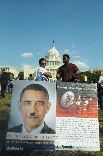 十月十三日,來自馬薩諸塞州、新罕布什爾州等的二十多個(gè)倡導(dǎo)移民改革團(tuán)體組織數(shù)千人在國會(huì)山舉行綜合移民改革大型集會(huì)。圖為一名機(jī)會(huì)者攜帶丑化奧巴馬的圖像,圖中奧巴馬被“貼上”德國納粹頭子希特勒標(biāo)志性的小胡子,下方寫著“這是你們的總統(tǒng)嗎?”等字樣。 中新社發(fā) 吳慶才 攝
