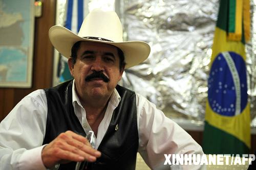 11月6日,在洪都拉斯首都特古西加爾巴的巴西駐洪大使館,洪遭罷免總統曼努埃爾·塞拉亞舉行新聞發布會。洪都拉斯臨時政府總統羅伯托·米切萊蒂5日宣布,他將組建新一屆聯合政府,但遭罷免總統曼努埃爾·塞拉亞被排除在外。塞拉亞隨后宣稱,不久前達成的和解協議已經破產。新華社/法新