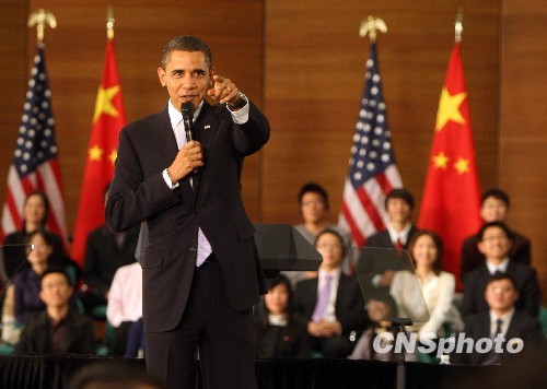 11月16日,正在中國進行國事訪問的美國總統(tǒng)奧巴馬,在上海就中美關(guān)系的未來向中國青年發(fā)表演講并回答提問。 中新社發(fā) 湯彥俊 攝
