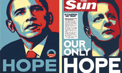 據(jù)香港《文匯報》報道,英國《太陽報》6日仿照奧巴馬2008年競選海報設(shè)計,推出支持保守黨黨魁卡梅倫的版面。