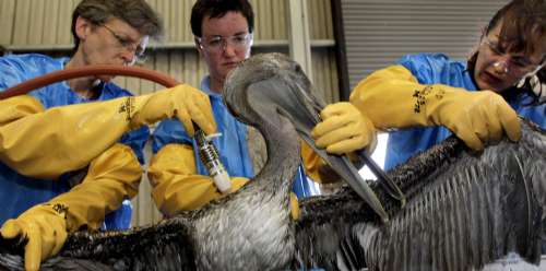 洛杉磯一間野生動物康復中心的工作人員正在清洗從墨西哥灣漏油區拯救上來的褐鵜鶘。