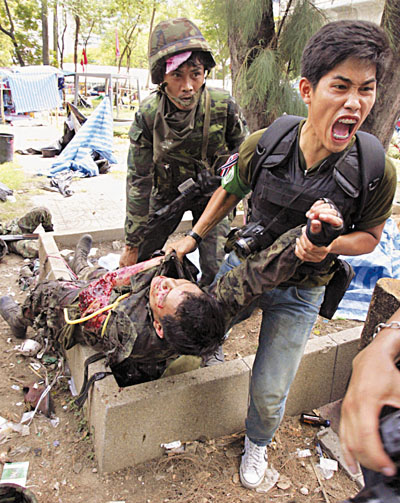 據香港《文匯報》報道,泰國軍方清場與紅衫軍激戰,曼谷慘成戰場,國際人權組織“人權觀察”20日指摘雙方嚴重侵犯人權,批評紅衫軍射殺記者,又以兒童作為人盾,行徑應遭譴責。