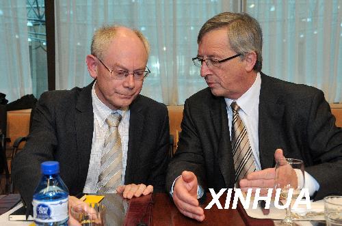 2010年3月15日,在比利時首都布魯塞爾的歐盟總部,歐元集團主席、盧森堡首相容克(右)與歐洲理事會常任主席范龍佩在歐元區財長會議上交談。當天,歐元區16國財政部長在布魯塞爾舉行會議,希臘債務危機成為會議的主要議題。新華社記者武巍攝