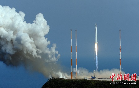 圖為韓國首枚運載火箭“羅老”號發射情景。