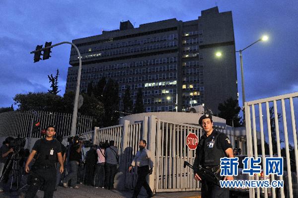 6月24日,警察在希臘首都雅典的希臘公民保護部大樓外警戒。希臘公民保護部大樓當日傍晚發生爆炸,造成1人死亡。 新華社/法新