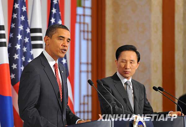 資料圖片:2009年11月19日,在位于韓國首都首爾的總統(tǒng)府青瓦臺,美國總統(tǒng)奧巴馬(左)在記者招待會上發(fā)言。新華社/法新