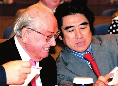 13日,讓·瑪麗·勒龐(左)在參加會議時與一名日本代表交頭接耳。圖/人民圖片