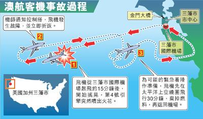 據香港《文匯報》網站2日報道,澳大利亞航空一架波音客機發生罕見意外。該架在美國舊金山起飛、原定飛往澳洲悉尼的客機在飛行途中一個引擎發生爆炸,引擎周圍的機殼出現一個大洞,乘客看到一道恍如彗星尾巴的火柱噴出,觸目驚心。飛機立即折返舊金山緊急降落,幸無人受傷。