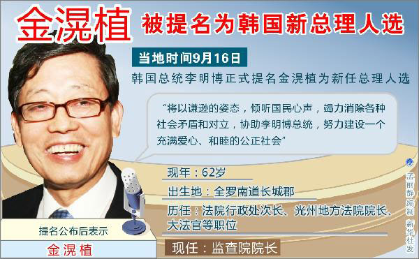 16日,韓國總統李明博提名現任監查院院長金滉植擔任新一任總理。總統府青瓦臺方面表示,相信金滉植會本著機會均等的憲法精神行事。