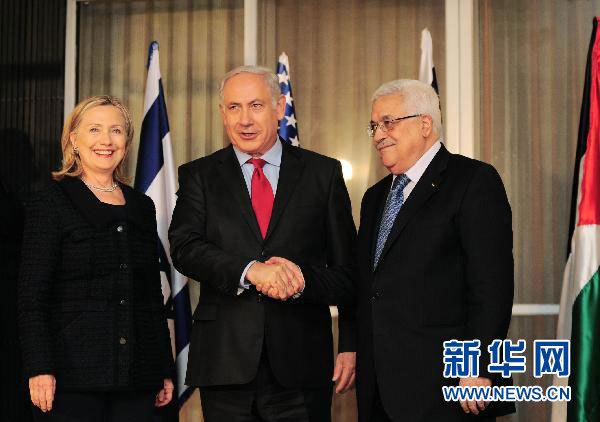 2010年9月15日,以色列總理內(nèi)塔尼亞胡(中)在耶路撒冷總理官邸與美國(guó)國(guó)務(wù)卿希拉里·克林頓(左)、巴勒斯坦民族權(quán)力機(jī)構(gòu)主席阿巴斯(右)會(huì)面。當(dāng)日,巴勒斯坦和以色列領(lǐng)導(dǎo)人在耶路撒冷繼續(xù)舉行雙方第二輪直接和談,美國(guó)國(guó)務(wù)卿希拉里參加談判。(新華社記者尹棟遜攝)