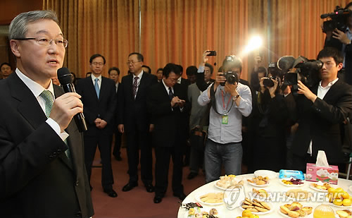 報(bào)道稱,由于前任長(zhǎng)官卸任已經(jīng)一個(gè)多月,而首爾G20峰會(huì)即將于下月11日舉行,新任外長(zhǎng)金星煥顯得有些心急,他向外交部所有工作人員發(fā)了一封電子郵件,并舉行了一個(gè)簡(jiǎn)單的茶會(huì)以此取代就任儀式。