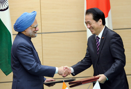 25日,東京,印度總理辛格(左)與日本首相菅直人在簽訂協議后握手。