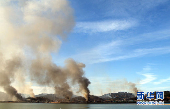11月23日,韓國西部延坪島上硝煙滾滾。韓國和朝鮮當日下午在有爭議的“北方界線”附近發生交火。新華社/法新
