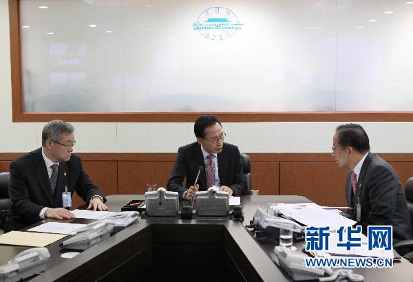 11月23日,在位于韓國首都首爾的韓國總統府青瓦臺,韓國總統李明博(中)在緊急安保長官會議上與韓國國防部長官金泰榮(右一)交談。