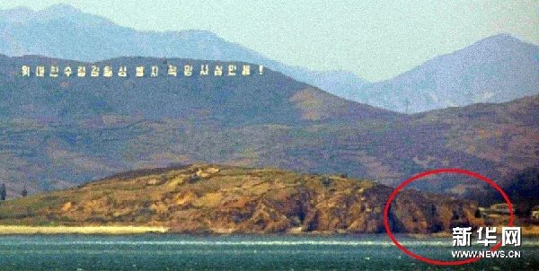 這是從韓國延坪島上拍攝的朝鮮一方海岸,標記部分為炮洞穴。新華社/聯合通訊社
