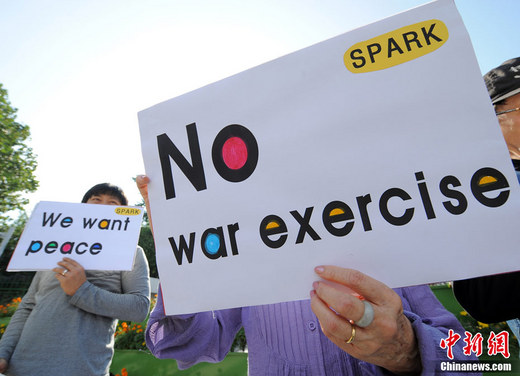 韓美反潛聯合軍事演習2010年9月27日在韓國西部海域(黃海)拉開帷幕。當日,一些韓國反戰人士在國防部門前集會抗議美韓聯合軍演。