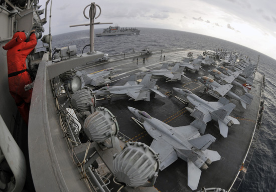 12月2日,美國海軍喬治-華盛頓號航母戰斗群在朝鮮半島西部海域進行物資補給作業,為即將到來的美日聯合軍演做準備。喬治-華盛頓號航母剛剛結束與韓國海軍進行的為期三天的黃海聯合軍演。
