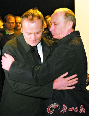 墜機事件后,俄羅斯總理普京(右)擁抱波蘭總理。