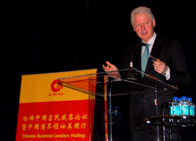 美國(guó)前總統(tǒng)克林頓向中國(guó)商界領(lǐng)袖發(fā)表演講。(美國(guó)《世界日?qǐng)?bào)》/曹健攝影)