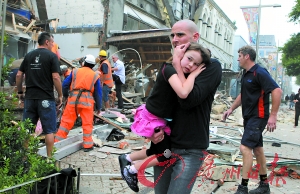 據新華社電 克賴斯特徹奇地震發生后,消防人員出動,試圖救出受困在建筑物內的人;警方用警戒線隔開市中心區域部分建筑,以防坍塌傷人。