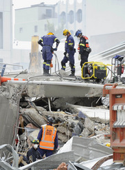 救援人員在新西蘭克賴斯特徹奇的CTV大樓廢墟中搜索幸存者。(共同社)