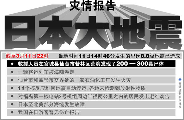 日本東北部海域當(dāng)天發(fā)生的里氏8.8級(中國地震局測定為里氏8.6級)地震及其引發(fā)的海嘯迄今已造成至少500人死亡,大量人員受傷或失蹤,尚不清楚有無中國公民傷亡。