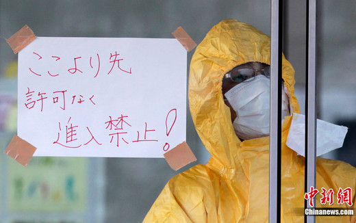 日本首相菅直人周一(14日)表示,在大地震和海嘯中受損的核電站仍然處于“警戒”狀態(tài)。東京電力公司周一向政府報告說,福島第一核電站輻射程度再次超過法定劑量。福島縣第一核電站在地震發(fā)生后已經(jīng)關(guān)閉,但是因反應(yīng)堆冷卻系統(tǒng)發(fā)生故障導(dǎo)致輻射超標。圖為在福島縣二本松,民眾隔離接受輻射檢測。