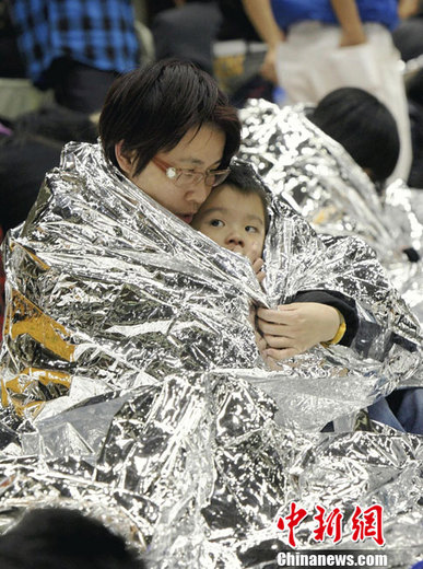 2011年3月11日,東京,在臨時避難所里,一位母親抱著自己的兒子。