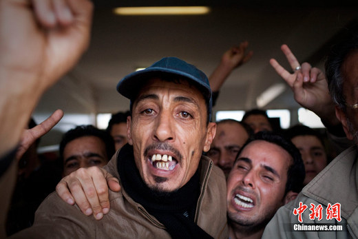 2011年3月19日,利比亞東部城市班加西一所醫院附近,一名男子激烈抗議空襲導致他的家人遇難。