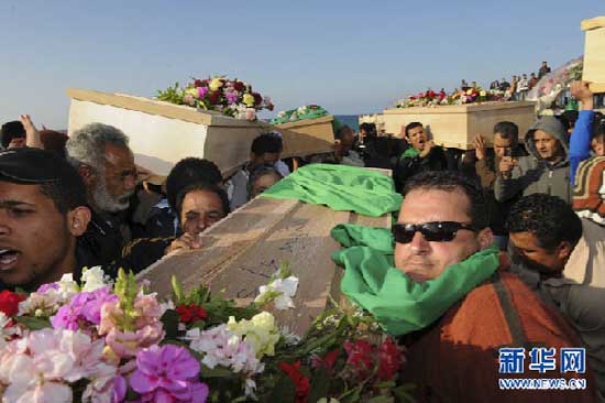 資料圖片:3月24日,在利比亞首都的黎波里,市民抬著即將下葬的棺槨走向一座公墓。利比亞官方當日宣布,近100名平民在西方聯軍空襲中喪生。新華社記者楊光攝