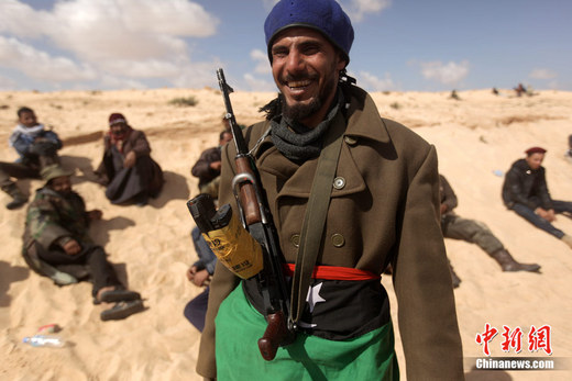 2011年3月21日,利比亞東部重鎮(zhèn)艾季達(dá)比耶市郊,一群反政府武裝人員在戰(zhàn)爭間隙休息。
