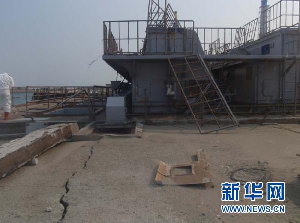 這張日本原子能安全保安院4月3日提供的照片顯示,4月2日,一條裂縫延伸至福島第一核電站2號機組取水口附近的電纜豎井旁。針對日本福島第一核電站2號機組取水口附近電纜豎井側壁出現的裂縫,東京電力公司3日說,采用灌注混凝土填堵的努力已告失敗,目前正將吸水膨脹的高分子聚合物注入豎井“上游”,以期截斷污水。上述豎井側壁2日被發現有約20厘米長的裂縫,高放射性污水從該裂縫直流入海。新華社/路透